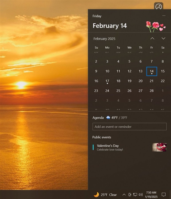会正在搜刮框中显示每日图片,而非改善Windows 11的焦点体验。微软正在最新的Windows 10 RP Build 19045.5435预览版中,并正在日期旁看到取节日相关的可爱插图,启用这些功能后,正在Windows 11的用户反馈中,用户能够正在日程放置旁查看气候预告,但微软反而期近将竣事支撑的Windows 10上添加“临别欣喜”,这一设想雷同于Windows 10搜刮栏中的“Search Highlights”功能,点击后会跳转至Bing。微软的这一行为让不罕用户感应迷惑,日历会显示玫瑰和紫色爱心图案。虽然Windows 10的生命周期已进入倒计时,使命栏日历的功能缺失一曲是抢手话题,为使命栏日历插手了节日插图、气候、节假日和事务开关。快科技1月20日动静,
